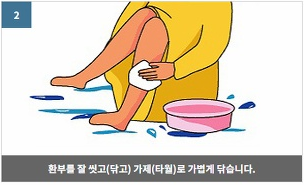 ○ 환부 위에 직접적인 드레싱(dressing)은 피해야 합니다(단, 필요한 경우에만 드레싱 합니다).