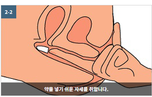 ○ 삽입이 어려운 경우에는 약의 표면에 물이나 로션, 베이비오일을 사용하면 쉽게 삽입할 수 있습니다.